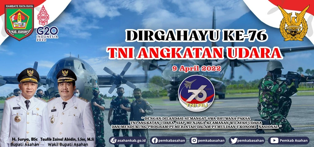 Di peringatan Hari Ulang Tahun yang ke – 76 tahun ini, Pemerintah Kabupaten Asahan mengucapkan Dirgahayu TNI Angkatan Udara. Semakin jaya, tangguh dan kuat untuk para TNI-AU, selalu jadi yang terdepan untuk membela tanah air.