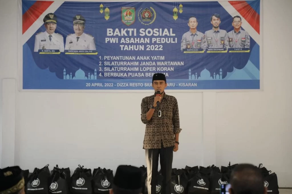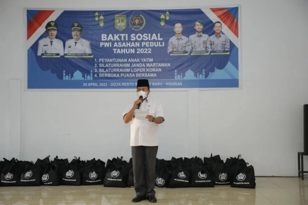 Bupati Asahan diwakili Asisten Ekonomi Pembangunan Drs. Muhilli Lubis hadiri Bakti Sosial Persatuan Wartawan Indonesia (PWI) Kabupaten Asahan Tahun 2022 yang dirangkai dengan Penyantunan Anak Yatim, Silaturrahim dengan Janda Wartawan, Silaturrahim dengan Loper Koran bertempat di Dizza Resto Siumbut Baru, Rabu (20/04/2022).
