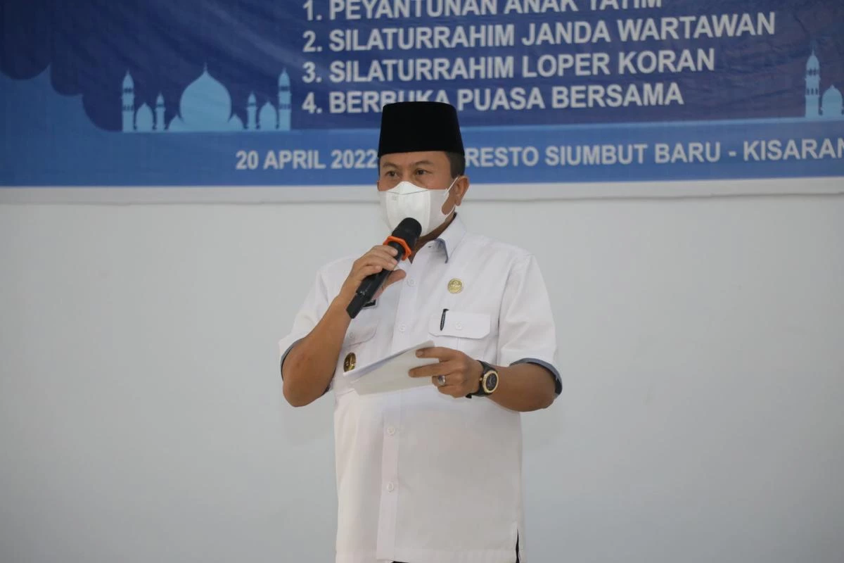 Bupati Asahan diwakili Asisten Ekonomi Pembangunan Drs. Muhilli Lubis hadiri Bakti Sosial Persatuan Wartawan Indonesia (PWI) Kabupaten Asahan Tahun 2022 yang dirangkai dengan Penyantunan Anak Yatim, Silaturrahim dengan Janda Wartawan, Silaturrahim dengan Loper Koran bertempat di Dizza Resto Siumbut Baru, Rabu (20/04/2022).