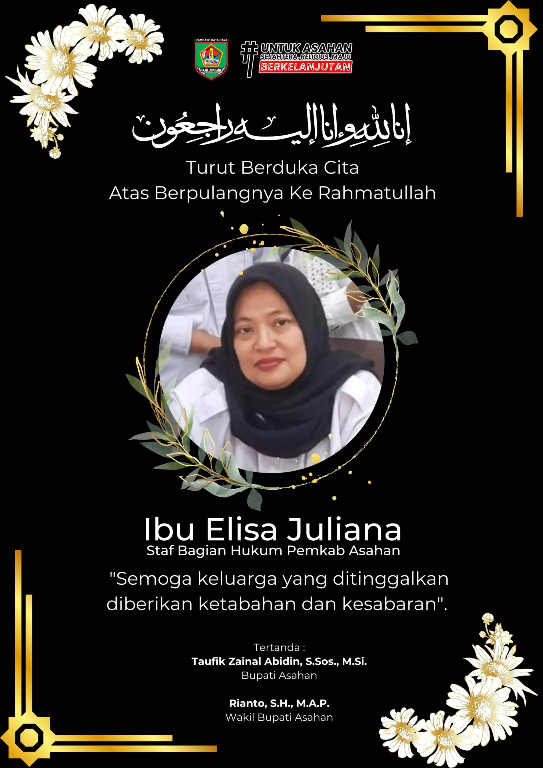 Innalillahi wa inna ilaihi raji’un. Turut Berduka Cita atas berpulangnya Ibu Elisa Juliana Staf Bagian Hukum Pemkab Asahan. Semoga amal ibadahnya diterima ALLAH SWT dan keluarga yang ditinggalkan diberi ketabahan. Aamiin Ya Robbal Alamiin