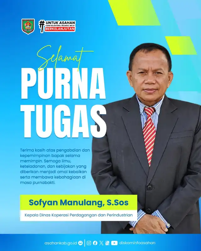 Pemerintah Kabupaten Asahan menyampaikan penghargaan dan apresiasi yang setinggi-tingginya kepada Bapak Sofyan Manulang, S.Sos, Kepala Dinas Koperasi, Perdagangan dan Perindustrian Kabupaten Asahan, atas dedikasi, loyalitas, serta pengabdian yang tulus dan penuh tanggung jawab selama menjalankan amanah jabatan.