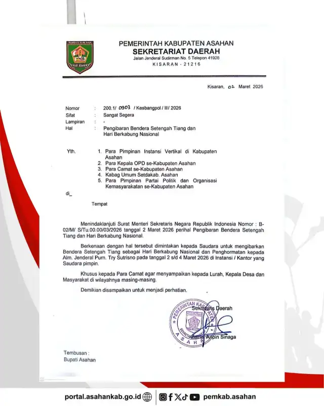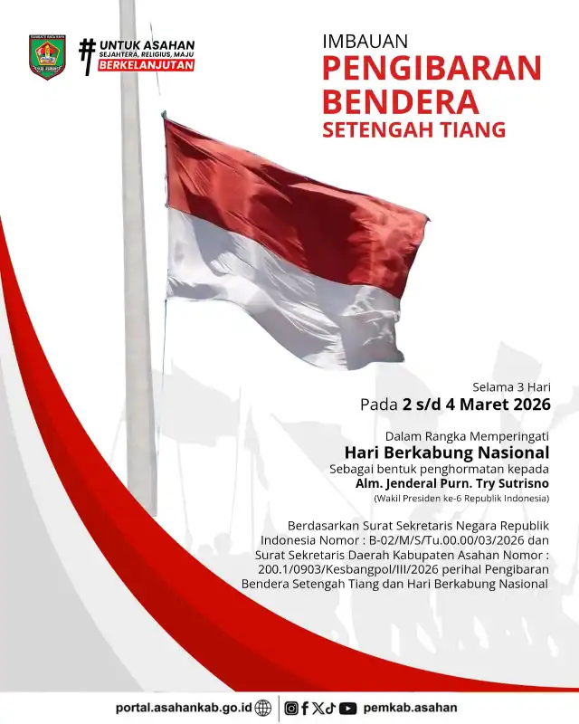 Dalam rangka Hari Berkabung Nasional sebagai bentuk penghormatan atas wafatnya Almarhum Jenderal TNI (Purn.) Try Sutrisno, Wakil Presiden ke-6 Republik Indonesia, dihimbau kepada seluruh Kantor Instansi Pemerintah sampai tingkat desa dan kelurahan, lembaga vertikal, BUMN/BUMD, instansi swasta, serta seluruh elemen masyarakat untuk mengibarkan Bendera Merah Putih setengah tiang selama 3 (tiga) hari, terhitung tanggal 2 s.d. 4 Maret 2026.