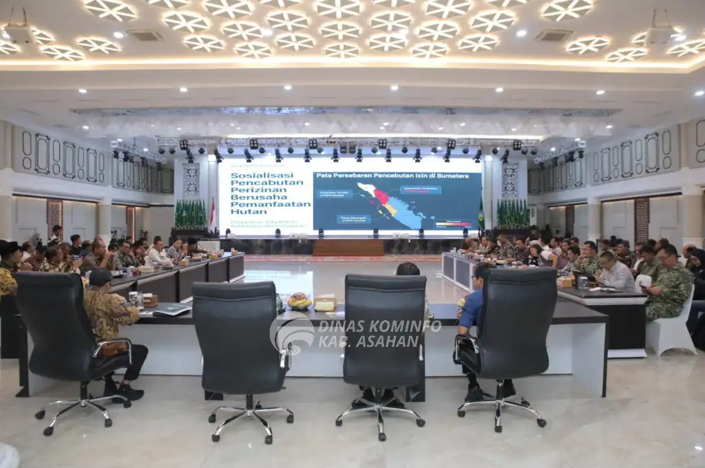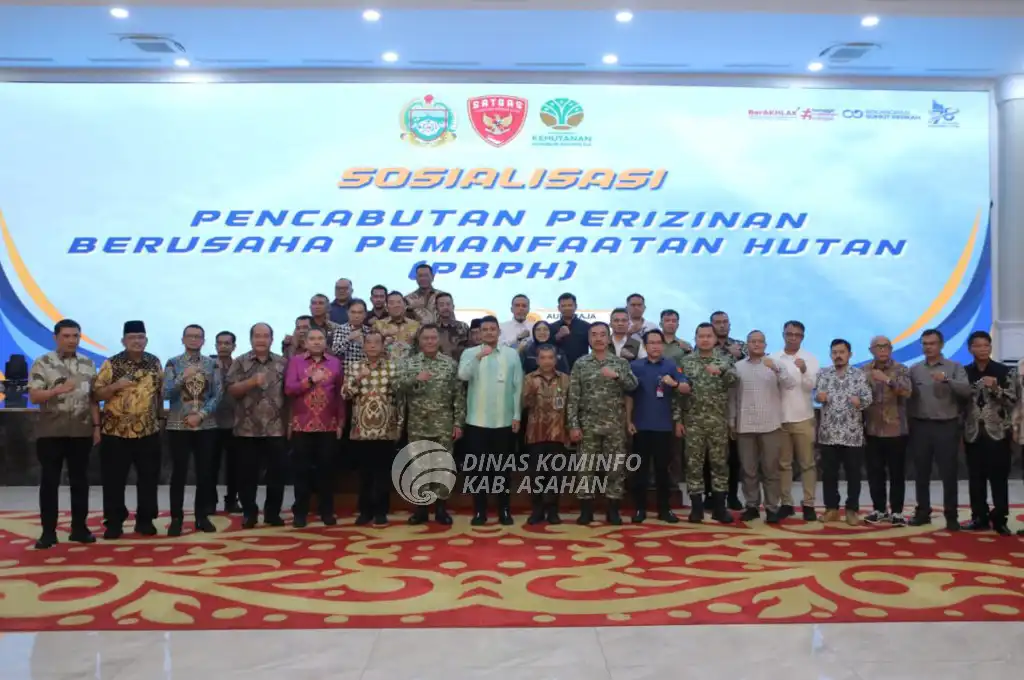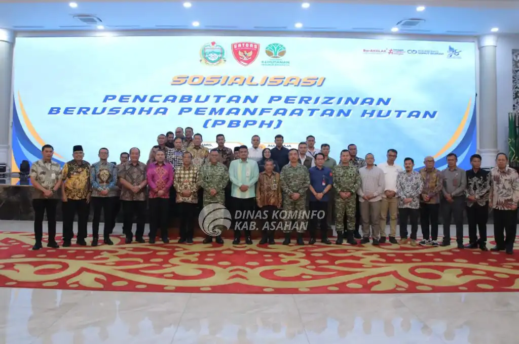 Medan, 16 April 2026 – Pemerintah Kabupaten Asahan menghadiri kegiatan sosialisasi pencabutan Perizinan Berusaha Pemanfaatan Hutan (PBPH) yang digelar di Aula Raja Inal Siregar, Provinsi Sumatera Utara. Kegiatan ini menjadi bagian dari upaya koordinasi lintas sektor dalam menyikapi kebijakan pencabutan izin kehutanan serta dampaknya terhadap masyarakat. Pemerintah Kabupaten Asahan dalam kesempatan ini dihadiri Bupati Asahan, Taufik Zainal Abidin, S.Sos., M.Si, didampingi Asisten Pemerintahan dan Kesejahteraan Rakyat Setda Kabupaten Asahan, Kepala Dinas Pertanian Kabupaten Asahan, Kepala Bagian Protokol, serta Kepala Bagian Umum Setda Kabupaten Asahan.