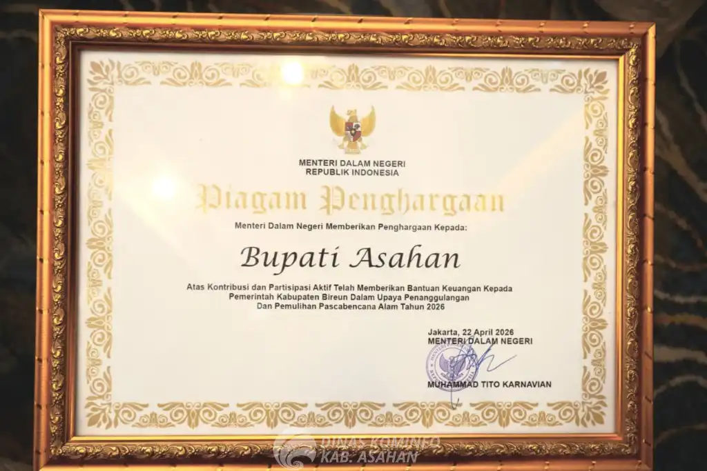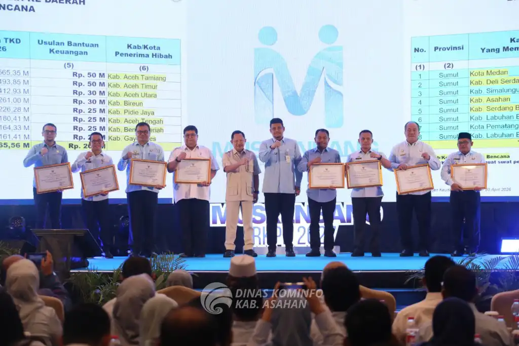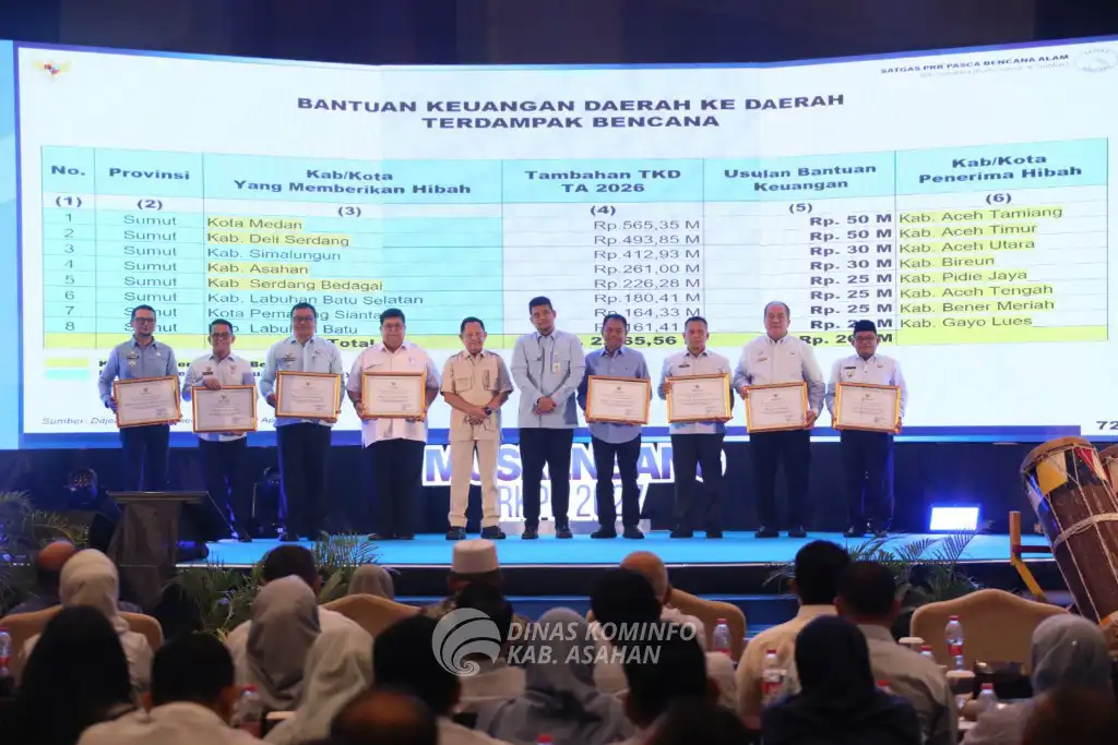 Penghargaan tersebut diberikan atas kontribusi dan partisipasi aktif Pemerintah Kabupaten Asahan dalam memberikan bantuan keuangan kepada Pemerintah Kabupaten Bireuen, Provinsi Aceh, guna mendukung penanggulangan serta pemulihan pascabencana alam tahun 2026. Piagam penghargaan diterima Bupati Asahan, Taufik Zainal Abidin, S.Sos., M.Si, yang hadir bersama Sekretaris Daerah Kabupaten Asahan, Kepala Bapperida beserta jajaran, serta Kepala OPD terkait dengan pelaksanaan Musrenbang Provinsi Sumatera Utara.
