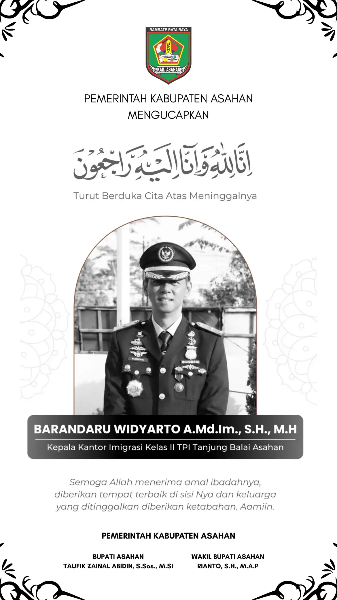 Pemerintah Kabupaten Asahan di bawah kepemimpinan Bupati Asahan Taufik Zainal Abidin, S.Sos., M.Si dan Wakil Bupati Asahan Rianto, S.H., M.A.P menyampaikan rasa duka cita dan belasungkawa yang mendalam atas berpulangnya Barandaru Widyarto, A.Md.Im., S.H., M.H, Kepala Kantor Imigrasi Kelas II TPI Tanjung Balai Asahan. Kepergian almarhum menjadi duka bagi keluarga besar Imigrasi serta seluruh pihak … Read more